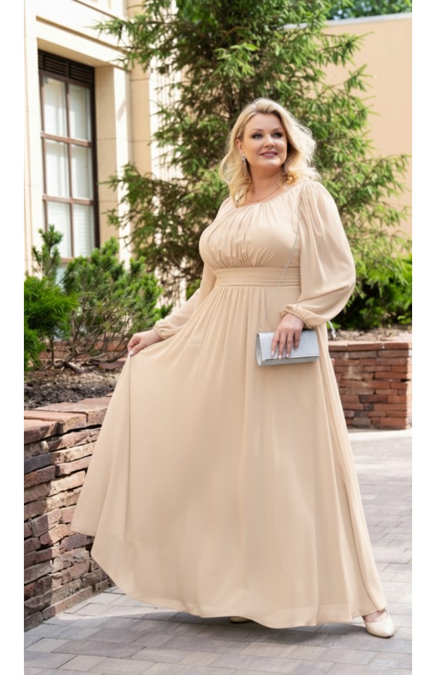 Нежное и сдержанное платье в пол из струящегося шифона, разработанное специально для женщин с формами. Закрытый верх с круглым вырезом создаёт утончённый образ, а длинные рукава добавляют благородства. Плавный силуэт подчеркивает фигуру, не сковывая движения. Идеально для официальных мероприятий и вечеров, где важен элегантный дресс-код.