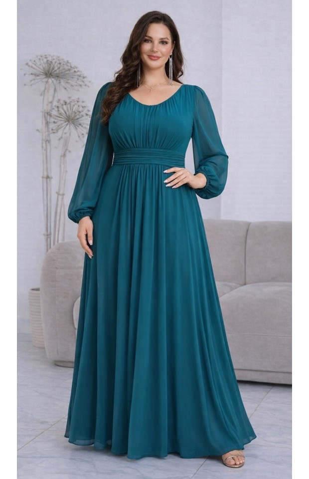 Нежное и сдержанное платье в пол из струящегося шифона, разработанное специально для женщин с формами. Закрытый верх с круглым вырезом создаёт утончённый образ, а длинные рукава добавляют благородства. Плавный силуэт подчеркивает фигуру, не сковывая движения. Идеально для официальных мероприятий и вечеров, где важен элегантный дресс-код.