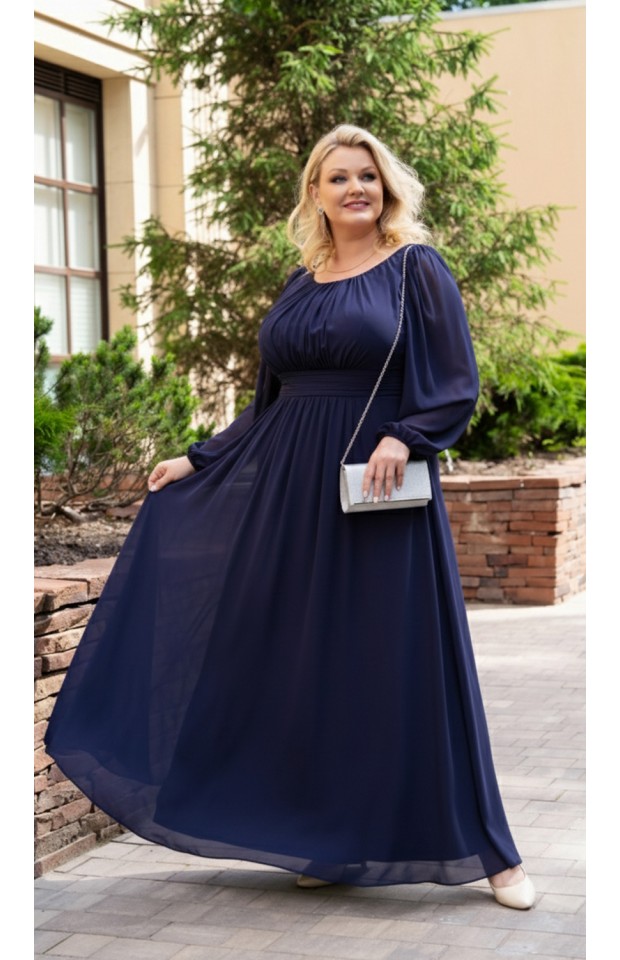Нежное и сдержанное платье в пол из струящегося шифона, разработанное специально для женщин с формами. Закрытый верх с круглым вырезом создаёт утончённый образ, а длинные рукава добавляют благородства. Плавный силуэт подчеркивает фигуру, не сковывая движения. Идеально для официальных мероприятий и вечеров, где важен элегантный дресс-код.