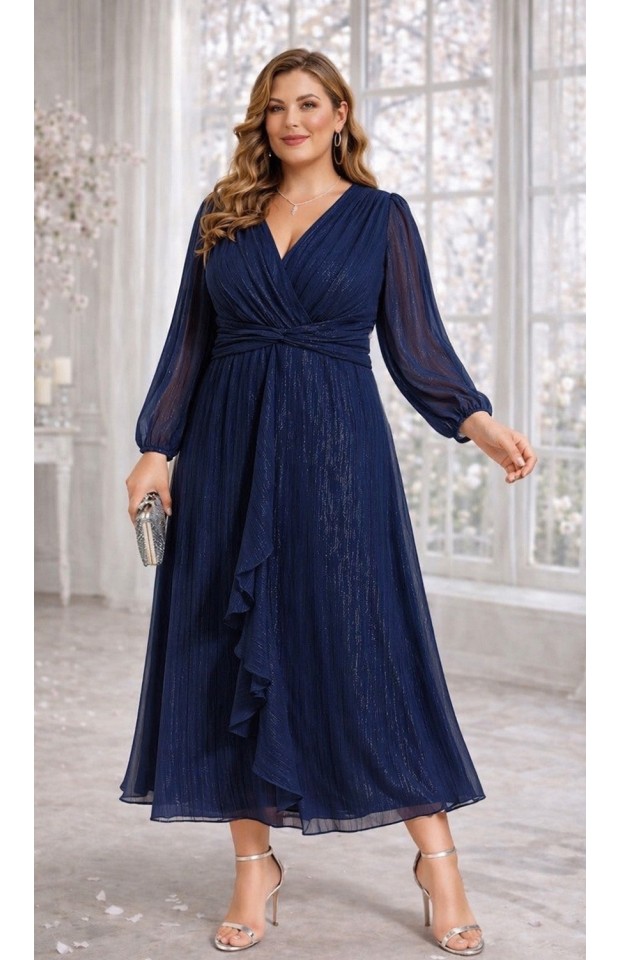 Платье красиво подчёркивает фигуру, акцентирует талию и при этом смотрится легко и благородно. Мерцающая фактура ткани добавляет нарядности без лишней вычурности.