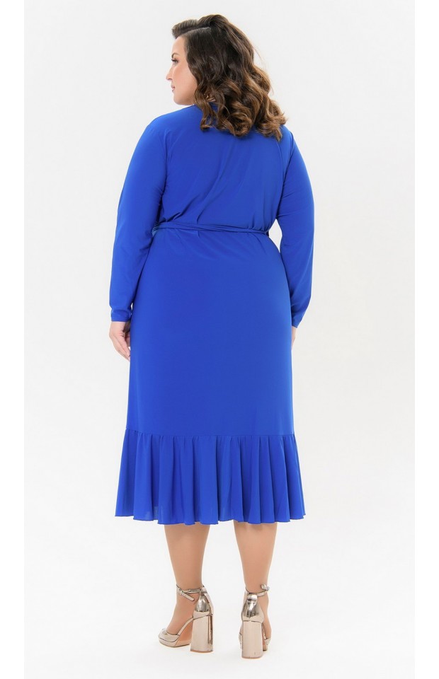 Платье с запАхом для девушек с роскошными формами. По передней части настрочен красивый волан, переходящий по линии низа на спинку. Правая часть переда платья завязывается с помощью поясков в узел, образуя драпировку. Рукав длинный.