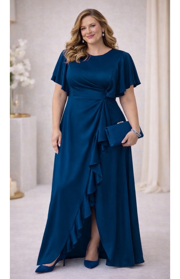 Длинное вечернее платье из матового шелка. Лиф с легкими спадающими рукавами в сочетании с длинной юбкой на запах идеально подчеркивает вечерний образ. Оригинальность модели придает вертикальный волан по разрезу. Вся суть этого платья - подчеркнуть достоинства и скрыть недостатки.