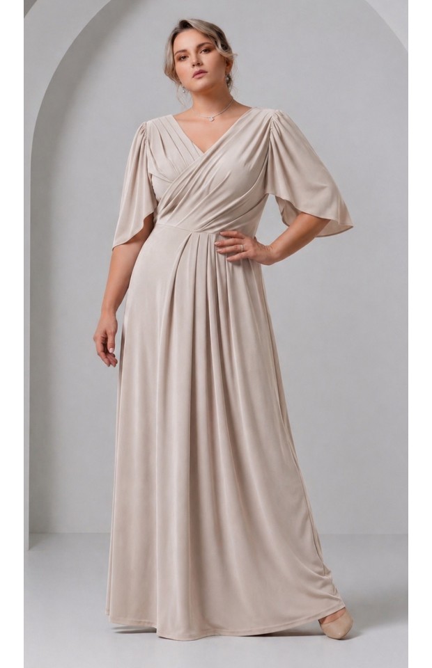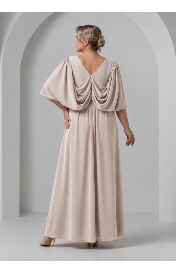 Вечерние платье из стрейчевой трикотажной основы, сложного свободного кроя.  Диагонально расположенные складочки запаха подчеркнут линию декольте, драпировки на спине скроют несовершенства фигуры, а длина в пол визуально сделает выше и стройнее. Хотим обратить ваше внимание, что реальный цвет платья может отличаться от представленного на изображении и зависеть от цветопередачи экрана вашего устройства.