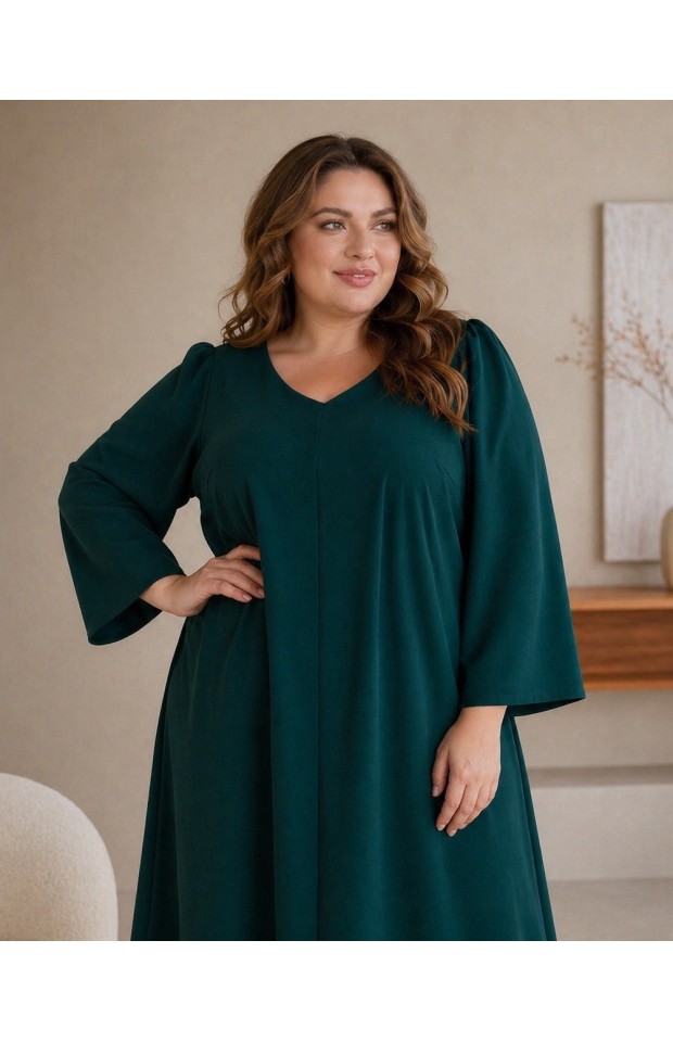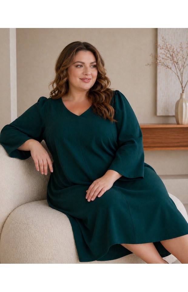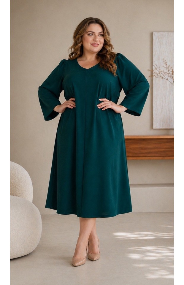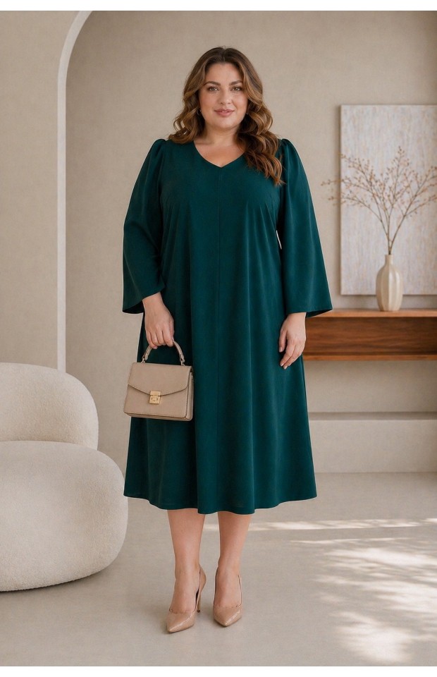 Платье А-силуэта, свободное, из плательного крепа с эластаном. Центральный шов по переду и V-вырез зрительно вытягивают силуэт. Рукав втачной, свободный,с легкой сборкой по окату, позволяет вместить любую полноту руки. Ткань - креп: 65% вискоза, 30% полиэстер, 5% эластан. Цвет черный. * длина изделия по спинке 122 см. На модели представлен 56 размер. Параметры модели: - рост 172 см - обхват груди 112 см - обхват бедер 118 см.