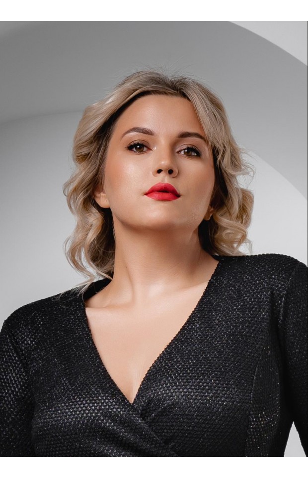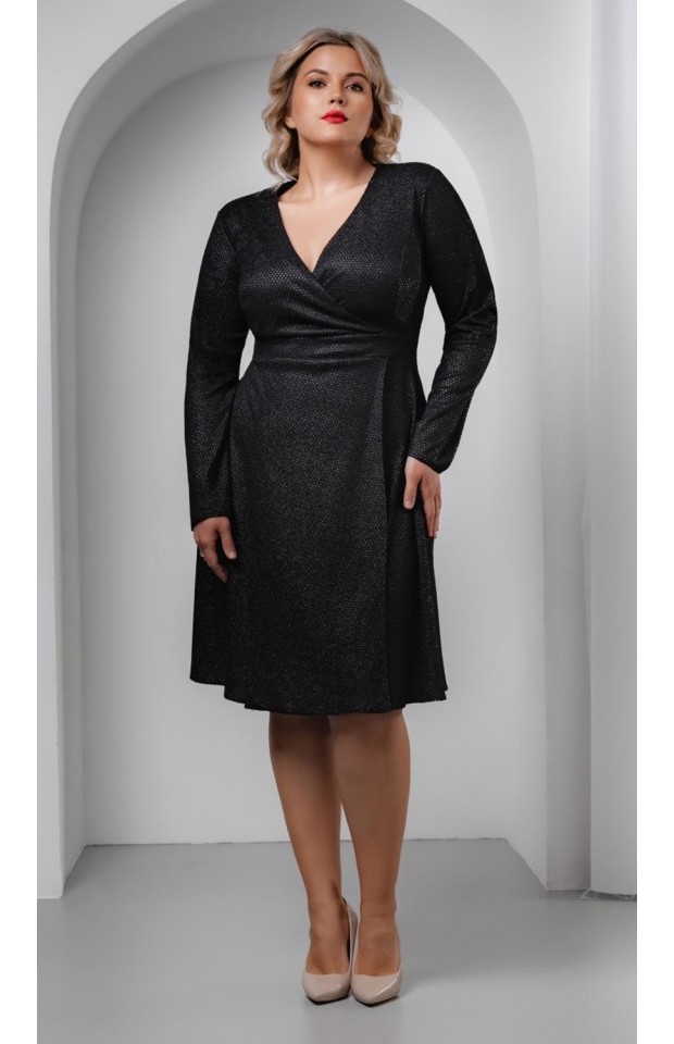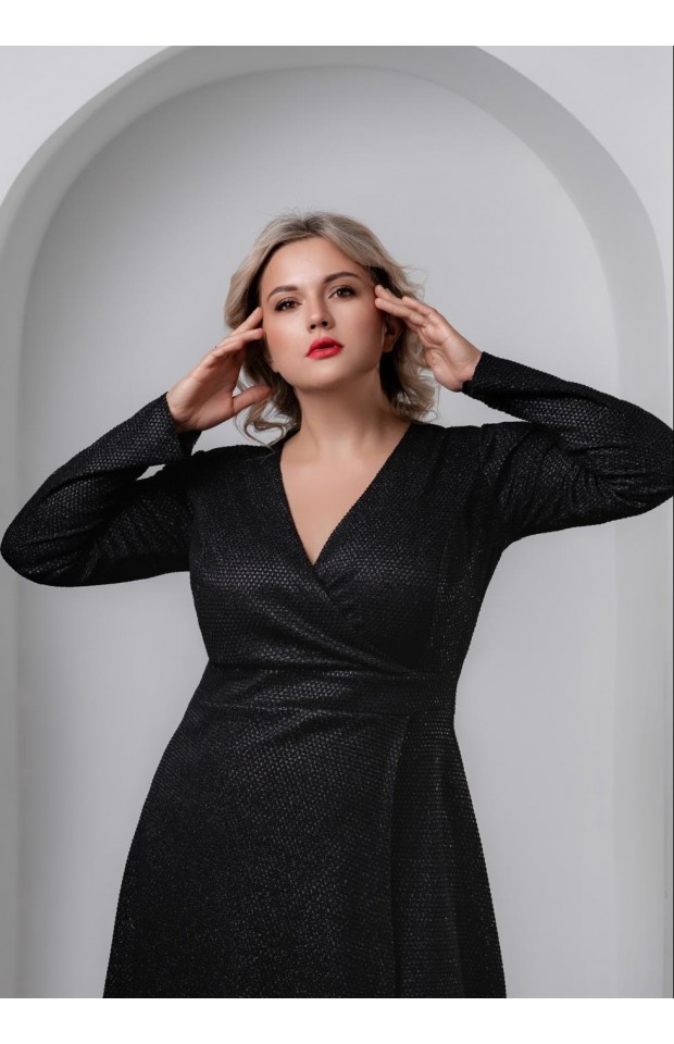 Короткое вечернее платье из ткани жаккард-металлик с длинным рукавом. Лиф и юбка на запах с подчеркнутой линией талии. Сдержанный и лаконичный образ на торжественное мероприятие.