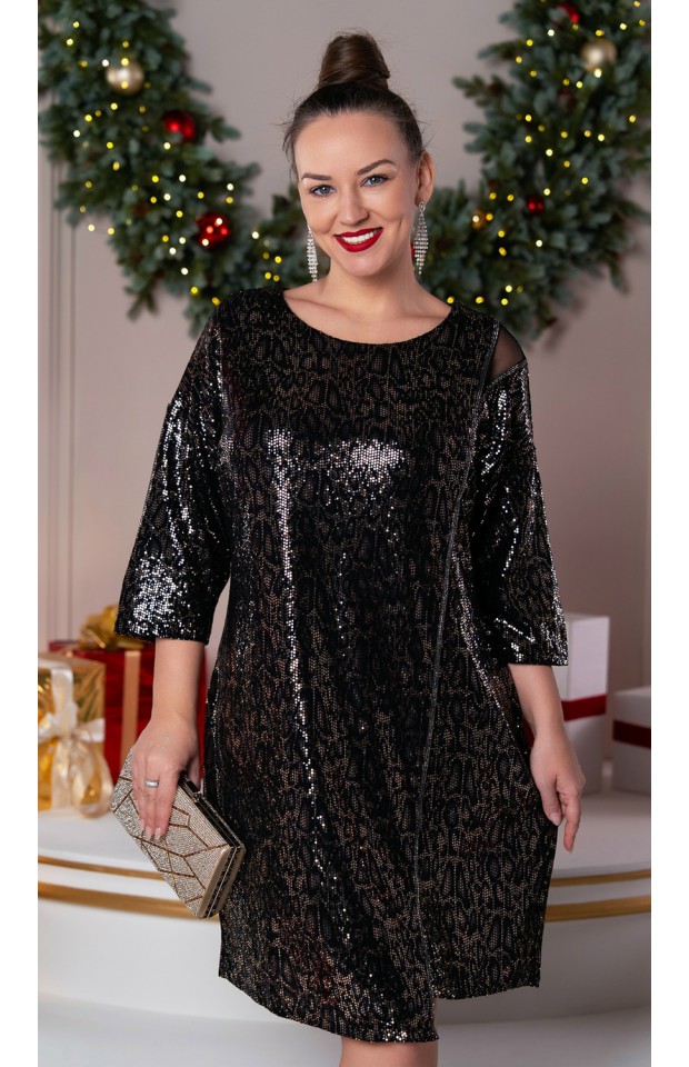 Эффектное черное платье с пайетками — выбор для тех, кто не боится быть в центре внимания. Трендовый анималистичный узор, выложенный мерцающими пайетками, смотрится дорого и актуально, а лаконичный прямой крой идеально подходит для полных женщин, не обтягивая, а мягко очерчивая фигуру. Оригинальная деталь в виде полупрозрачной вставки на плече добавляет образу пикантности и легкости. Рекомендуем купить это вечернее платье (размеры до 58-го) для создания смелого и запоминающегося образа на Новый год.