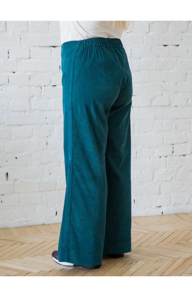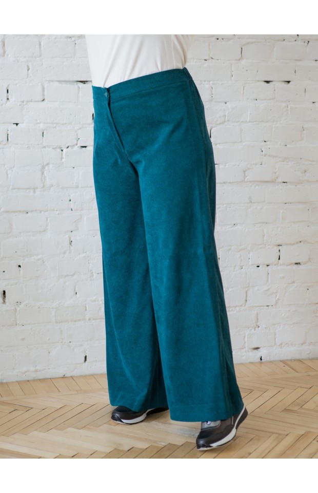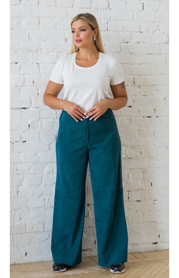 Удобные брюки-палаццо, выполнены из эластичного микровельвета. Брюки с высокой посадкой, с притачным поясом с застежкой на замок-молнию и кнопку по переду. Пояс брюк на широкой резине обеспечивает удобство и комфорт при ношении. Брюки без подклада. Длина по внешнему шву (с поясом) в 48 р-ре – 108 см. в 62 р-ре – 113 см., длина по внутреннему (шаговому) шву в 48 р-ре – 82 см. в 62 р-ре – 83 см.