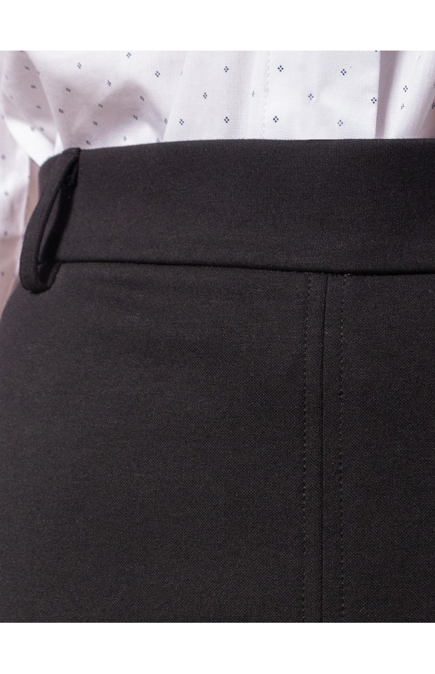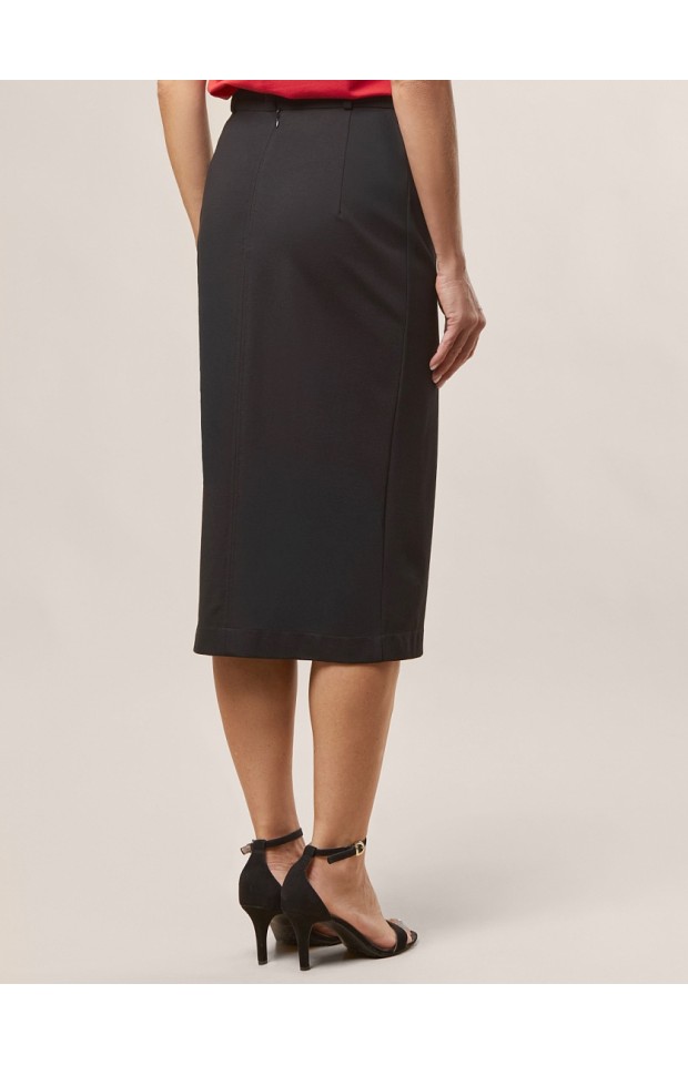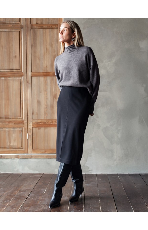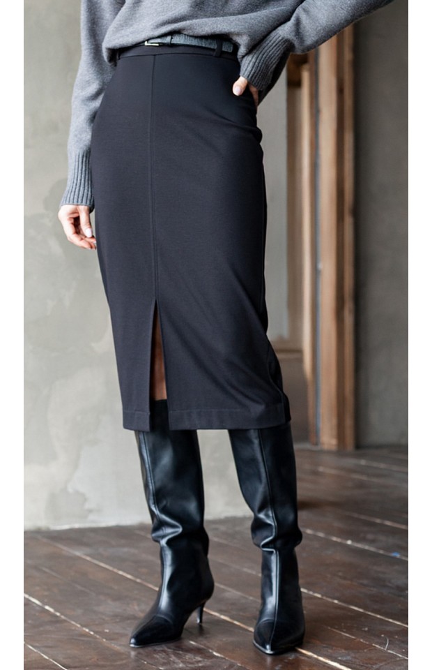 Юбка-карандаш выполнена из плотного джерси. Модель без подкладки дополнена разрезом спереди. Эластичный материал хорошо садится по фигуре обеспечивая абсолютный комфорт. Сзади застежка на потайную молнию.