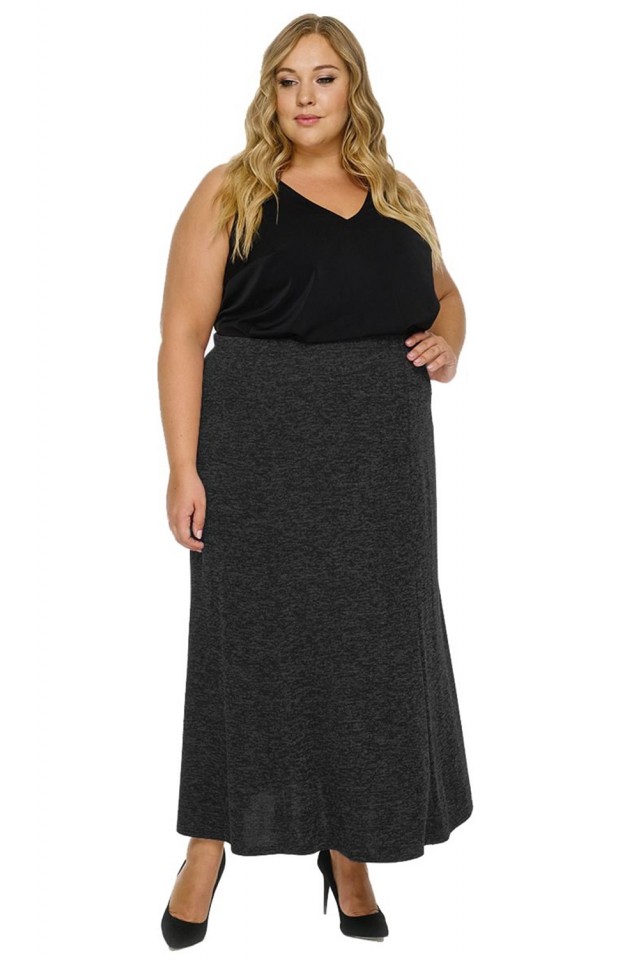 Длинная юбка силуэта годе из меланжевого джерси, на подкладке. За счет клиньев, расширяющихся к низу, юбка зрительно вытягивает силуэт. Верх на широкой резинке, не стесняющей движение.