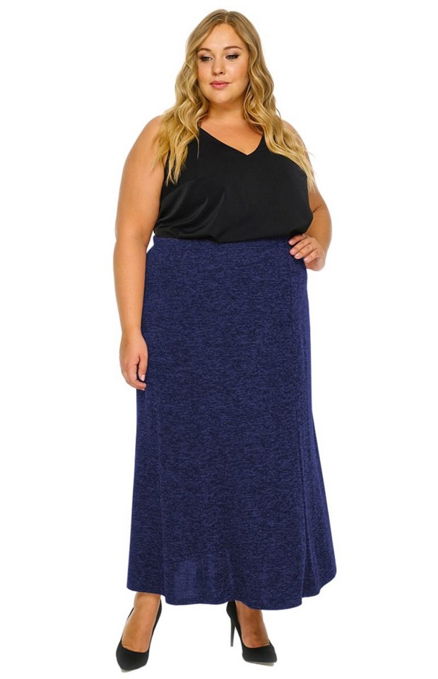 Длинная юбка силуэта годе из меланжевого джерси, на подкладке. За счет клиньев, расширяющихся к низу, юбка зрительно вытягивает силуэт. Верх на широкой резинке, не стесняющей движение.