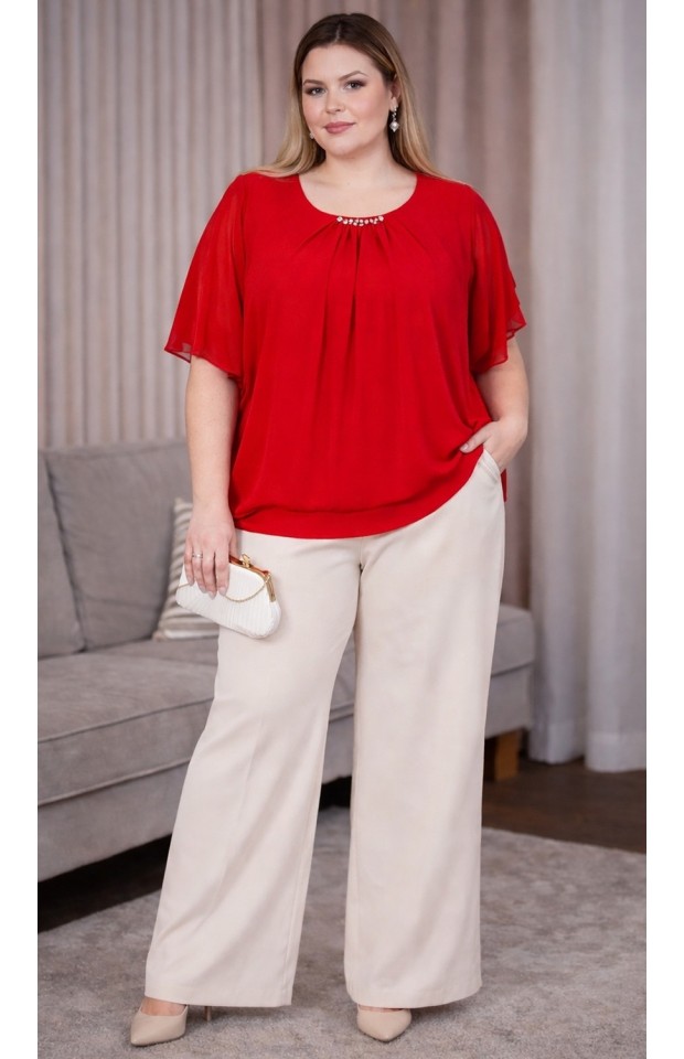 Блузка свободного кроя из мягкого шифона на эластичной подкладе. Круглый вырез на груди декорирован небольшими складками и стразами, что добавляет образу блеска и изящества. Прозрачные шифоновые рукава придают воздушности и лёгкости. Свободный силуэт искусно обыгрывает фигуру и не сковывает движений. Притачная резинка по низу способствует оптимальной посадке по фигуре. Модель легко сочетается с любым низом, поэтому скомбинировать чудесный и стильный образ с юбками, легинсами, брюками не составит труда.