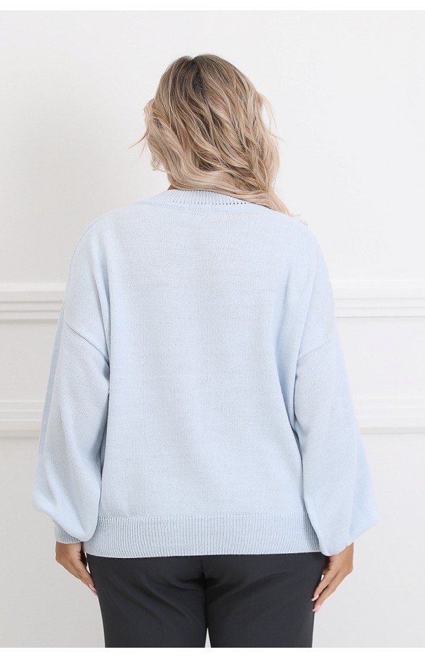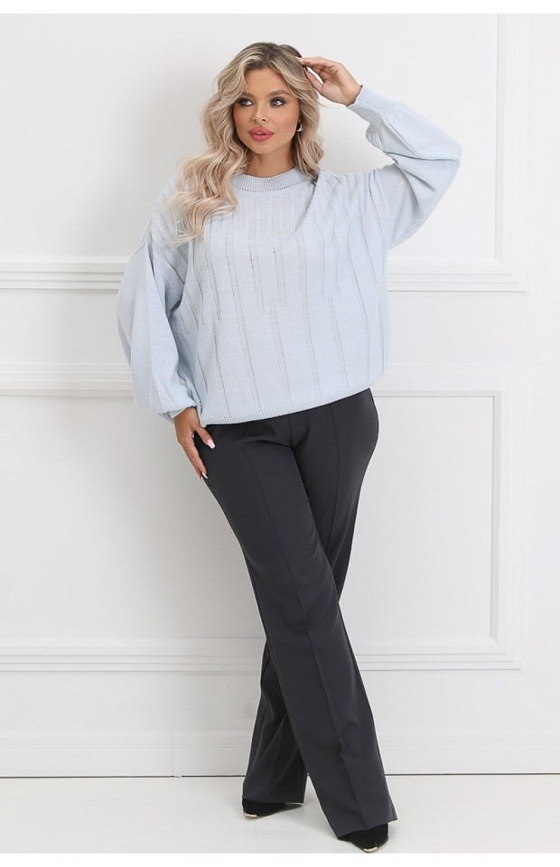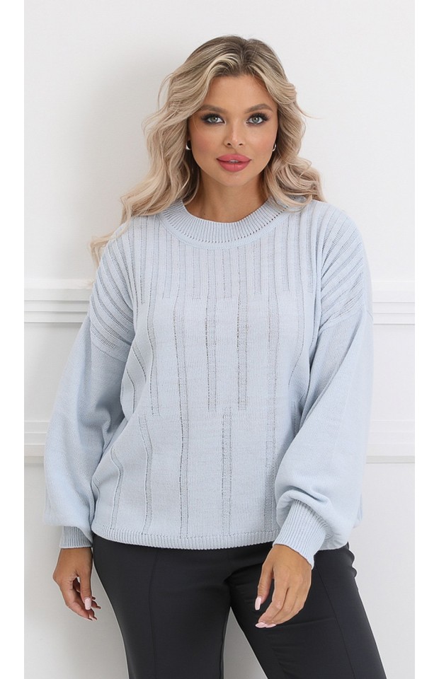 Стильный джемпер свободного силуэта, выполненный из акрила и шерсти. Длина изделия по спинке от плечевого шва до низа изделия - 66 см.