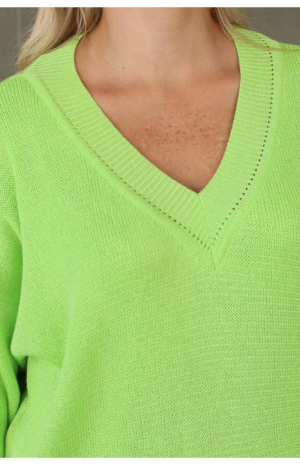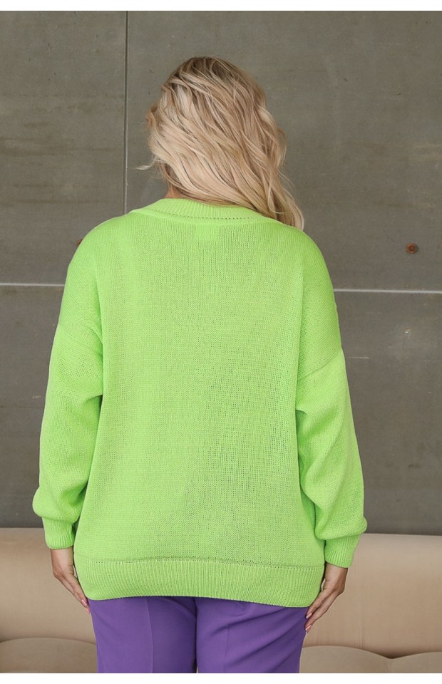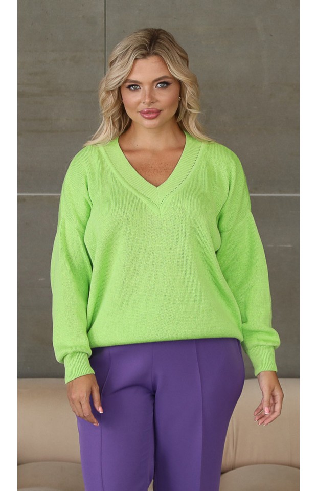 Эффектный джемпер свободного силуэта бордового цвета. Джемпер выполнен в технике «ручного вязания» из натуральных хлопковых нитей. V-образный вырез изделия обработан двусторонней лицевой бейкой. Низ изделия и втачные рукава обработаны манжетами, выполненные в технике «резинка». Длина изделия по спинке от плечевого шва до низа изделия — 69 см.