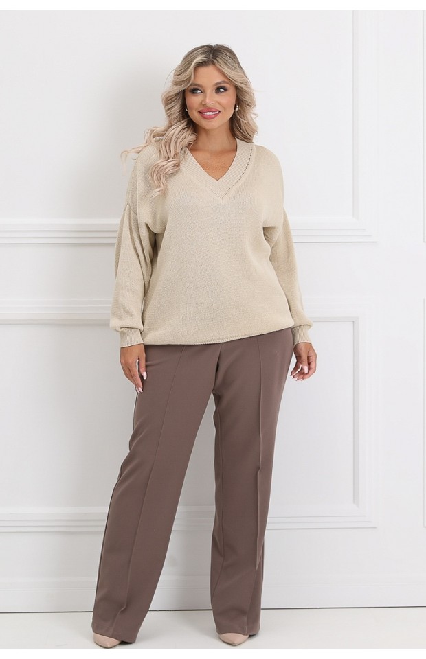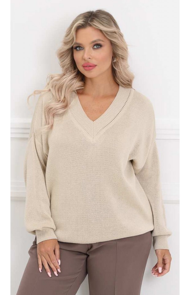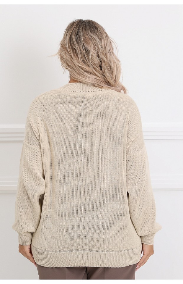 Эффектный джемпер свободного силуэта бордового цвета. Джемпер выполнен в технике «ручного вязания» из натуральных хлопковых нитей. V-образный вырез изделия обработан двусторонней лицевой бейкой. Низ изделия и втачные рукава обработаны манжетами, выполненные в технике «резинка». Длина изделия по спинке от плечевого шва до низа изделия — 69 см.