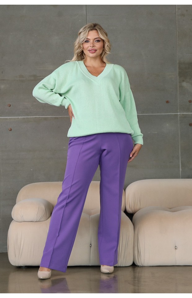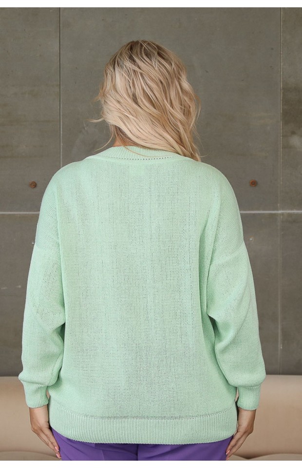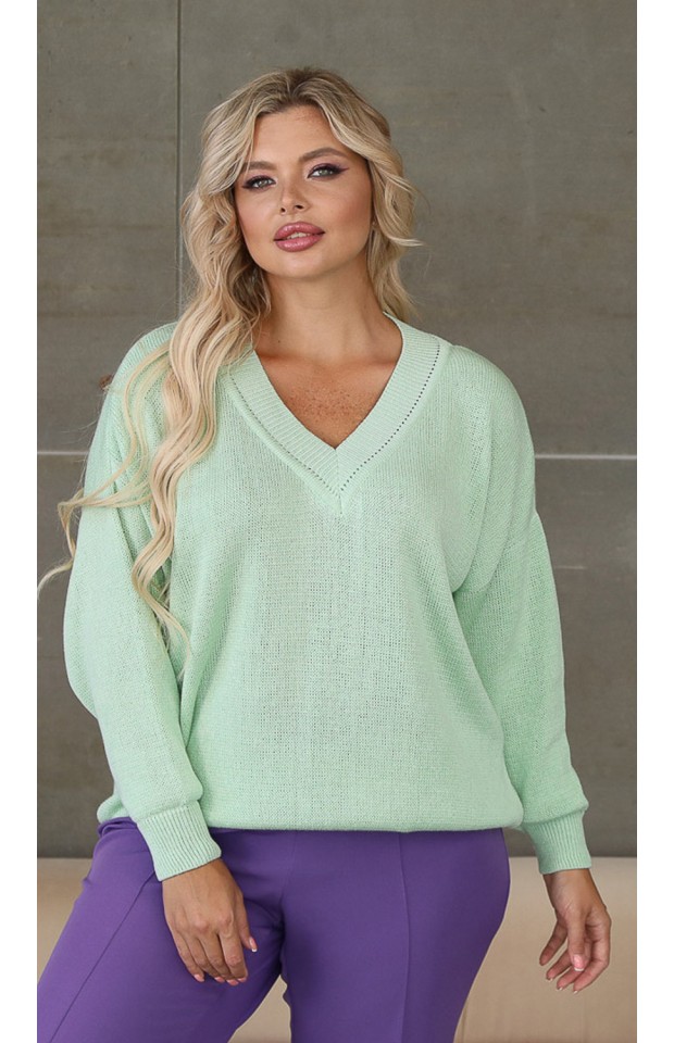 Эффектный джемпер свободного силуэта бордового цвета. Джемпер выполнен в технике «ручного вязания» из натуральных хлопковых нитей. V-образный вырез изделия обработан двусторонней лицевой бейкой. Низ изделия и втачные рукава обработаны манжетами, выполненные в технике «резинка». Длина изделия по спинке от плечевого шва до низа изделия — 69 см.