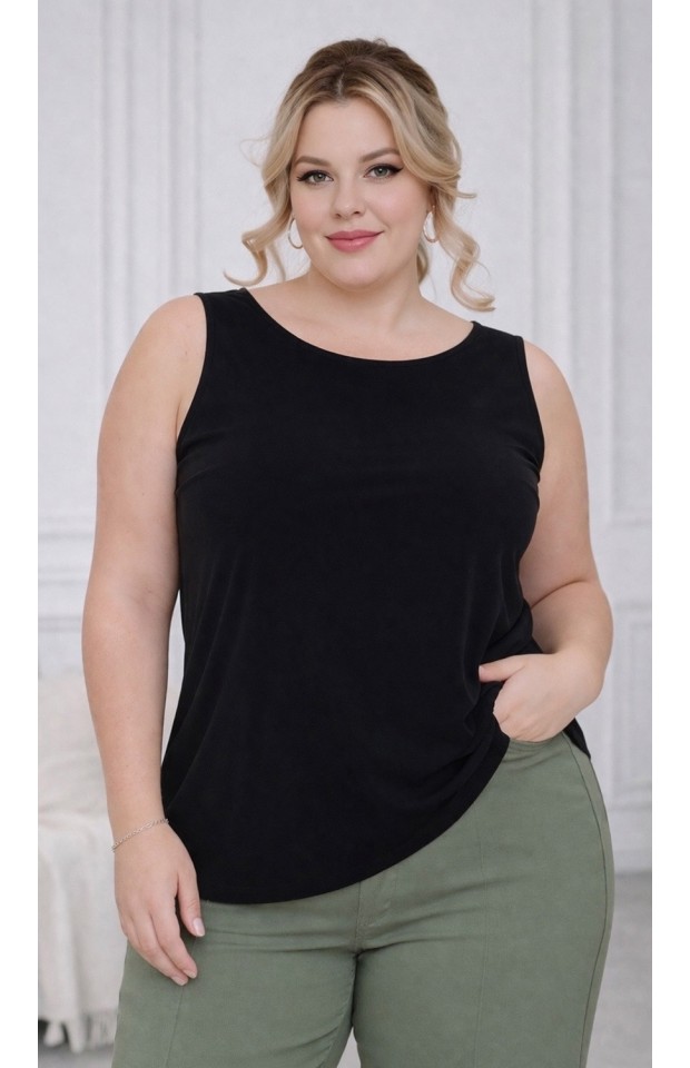 Классический однотонный топ свободного кроя из струящегося материала на широких бретелях. Круглый вырез добавляет модели женственности и романтизма. Модель можно комбинировать с юбками и брюками, так же будет хорошей базой под пиджаки и жакеты.